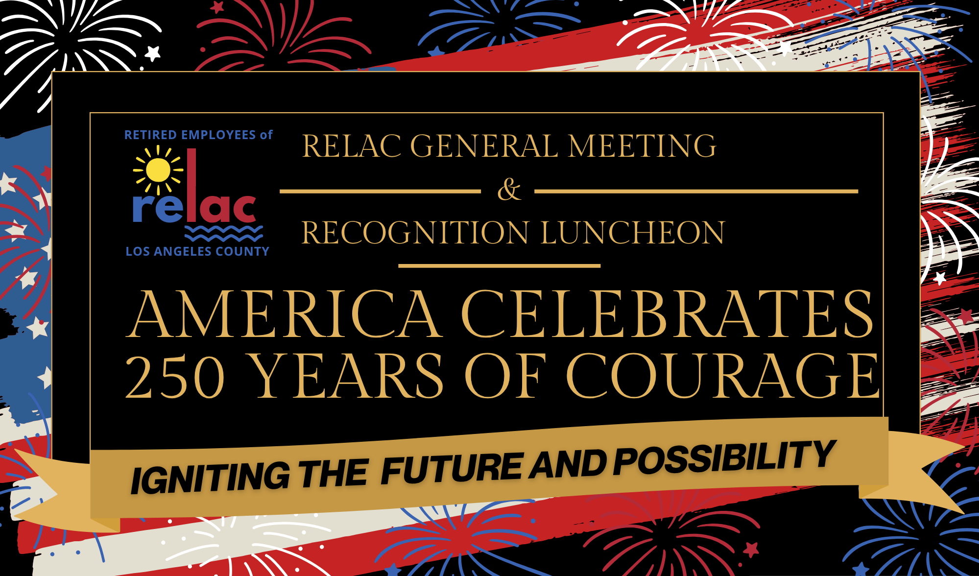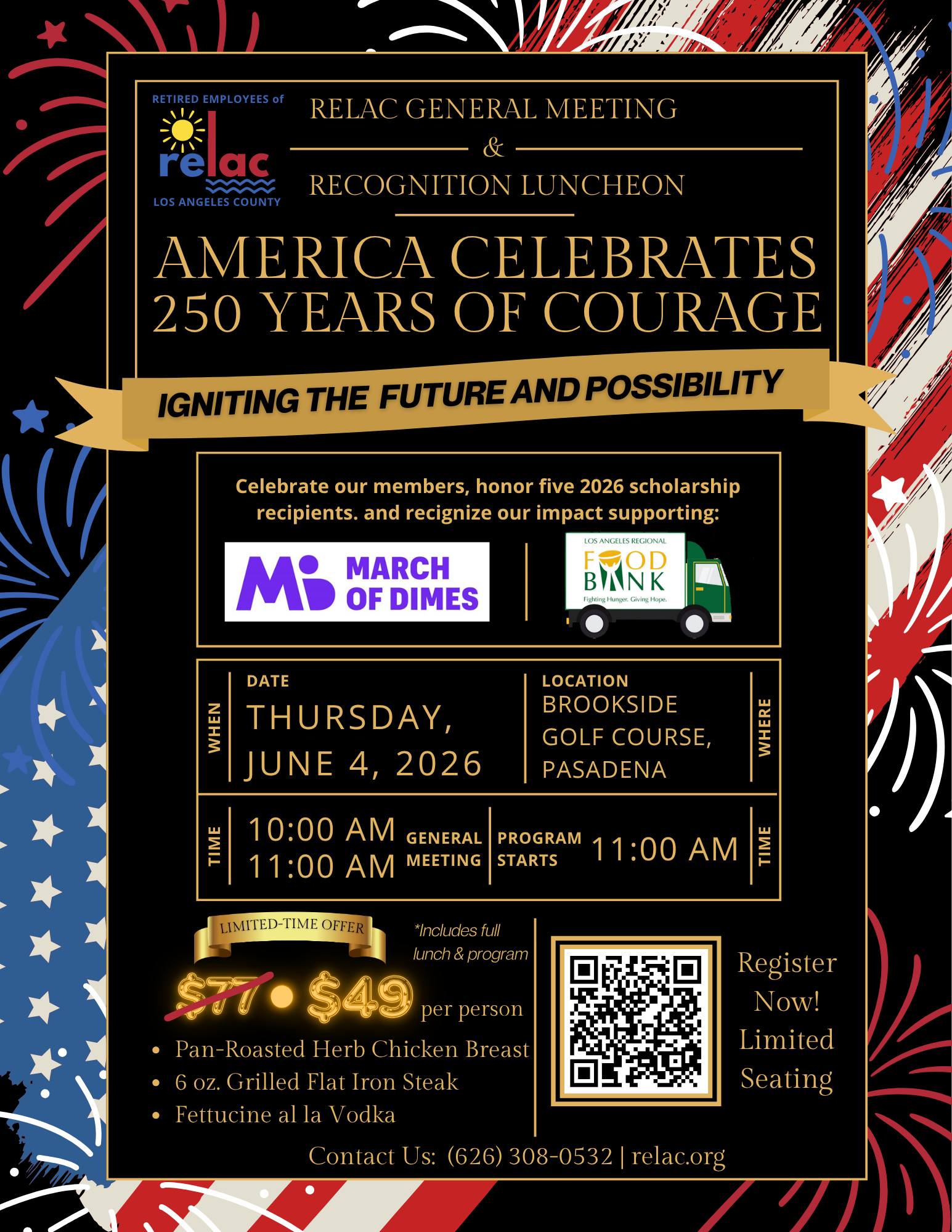 Join us for RELAC’s upcoming General Meeting and Recognition Luncheon, a special event celebrating “America Celebrates 250 Years of Courage: Igniting the Future of Possibility.” This inspiring gathering will honor our members, recognize five 2026 scholarship recipients, and highlight RELAC’s impactful support of the March of Dimes and the Los Angeles Regional Food Bank.