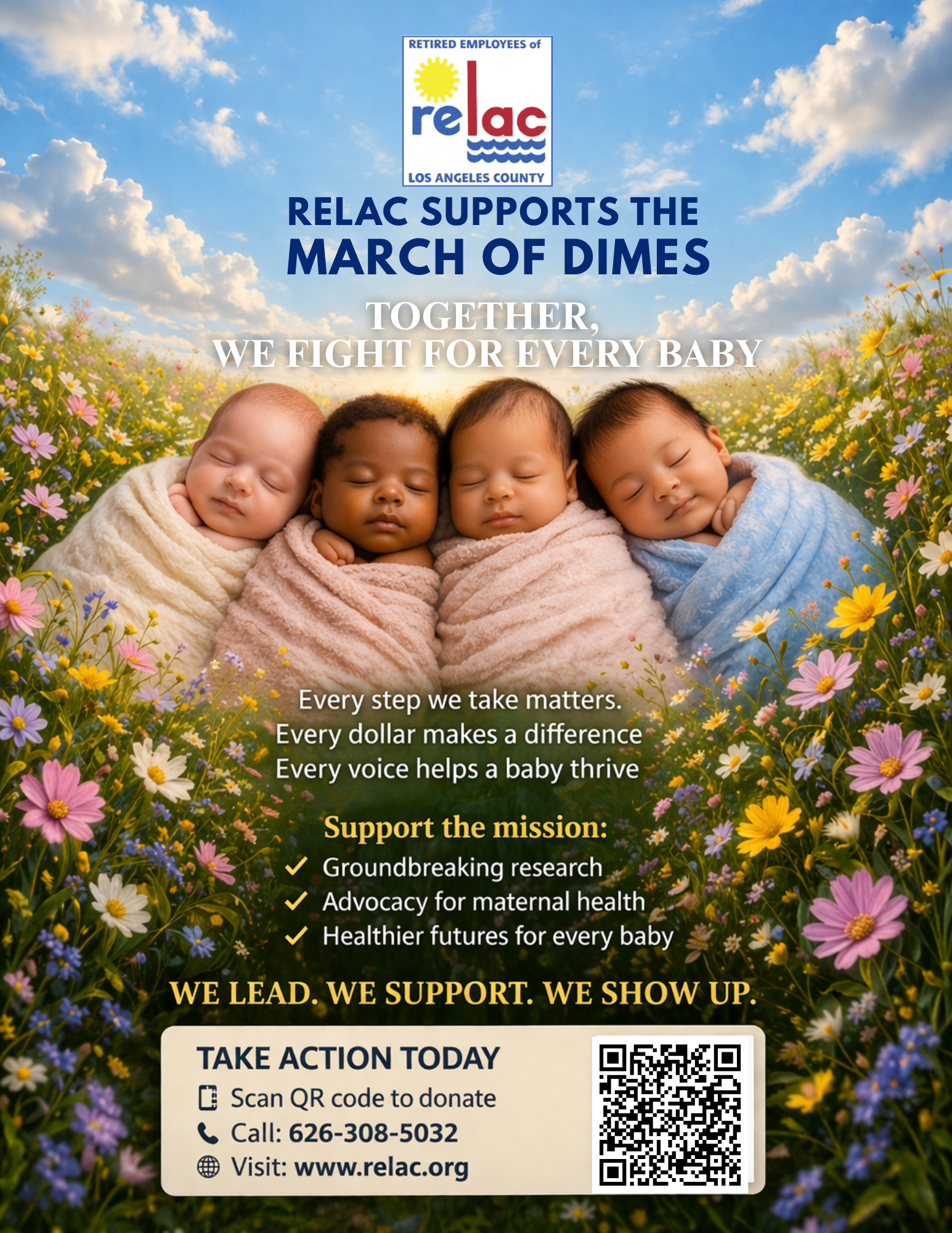 At RELAC, we are more than just a community of retired Los Angeles County employees — we are a family that cares deeply about the next generation. That is why we are proud to support the March of Dimes, an organization dedicated to improving the health of mothers and babies across the Country.
